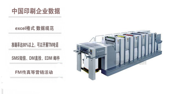 最新印刷生產(chǎn)與貿(mào)易企業(yè)黃頁數(shù)據(jù)更新日期2024年12月最新,全國印刷企業(yè)名單共81730條,都是具有一定規(guī)模的印刷行業(yè)的注冊實體企業(yè),數(shù)據(jù)準確率高,是您開展各項營銷活動的必備資料。印刷企業(yè)黃頁包括:企業(yè)名稱、地址、電話、傳真、郵箱、登記日期、經(jīng)營范圍、注冊資金等信息。印刷企業(yè)名單數(shù)據(jù)為Excel格式,信息可任意修改、復制、打印、導出及導入到傳真、郵件群發(fā)等印刷中,無任何限制。