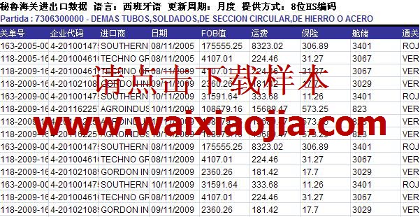 秘魯進(jìn)口關(guān)單數(shù)據(jù),以秘魯本土企業(yè)向全球 200 多個國家和地區(qū)進(jìn)口各類商品的進(jìn)口申報單證為依據(jù)。按照具體產(chǎn)品的精確 HS 編碼提供。數(shù)據(jù)內(nèi)容包括: 海關(guān)單號、企業(yè)代碼、進(jìn)口商、日期、 FOB 值、 運(yùn)費(fèi)、保險、艙儲、通關(guān)類型、凈重、件數(shù) 、序號、海關(guān)編碼、產(chǎn)品描述、數(shù)量、單位、采購國、原產(chǎn)國、凈重、 FOB 價、 運(yùn)費(fèi)、保險、證書、從價、銷售稅等項次內(nèi)容。