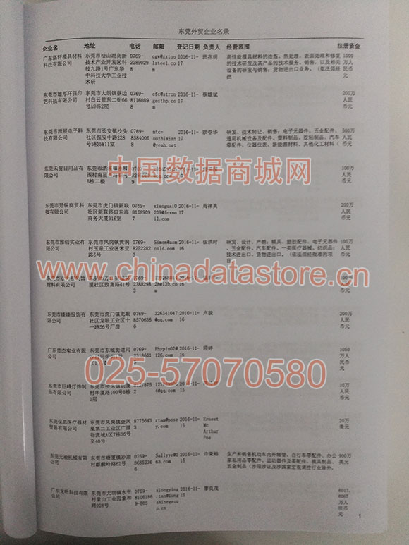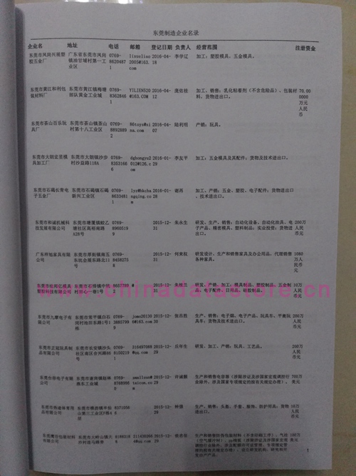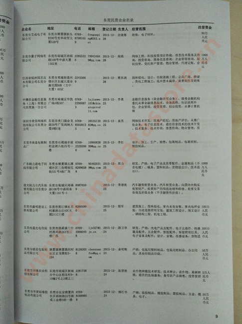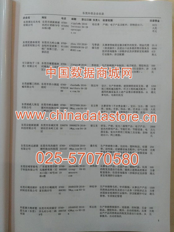 2021版最新東莞企業(yè)黃頁(yè)包括《東莞制造企業(yè)黃頁(yè)》、《東莞貿(mào)易企業(yè)黃頁(yè)》、《東莞民營(yíng)企業(yè)黃頁(yè)》、《東莞外資企業(yè)黃頁(yè)》、《東莞外貿(mào)企業(yè)黃頁(yè)》共五冊(cè),現(xiàn)優(yōu)惠價(jià):280元/冊(cè)。每?jī)?cè)內(nèi)容包括:?jiǎn)挝幻Q、地址、郵編、電話、傳真、郵箱、經(jīng)營(yíng)范圍等;東莞企業(yè)黃頁(yè)涵蓋了近幾年來(lái)最新成立的、有一定規(guī)模的企業(yè),具有非常高的營(yíng)銷價(jià)值。有了這套黃頁(yè)開展業(yè)務(wù)也有了針對(duì)性,也省去了盲目去尋找客戶名單而浪費(fèi)的時(shí)間了,工作效率也會(huì)有很大的提高。歡迎需要東莞企業(yè)黃頁(yè)的朋友及時(shí)聯(lián)系我們!