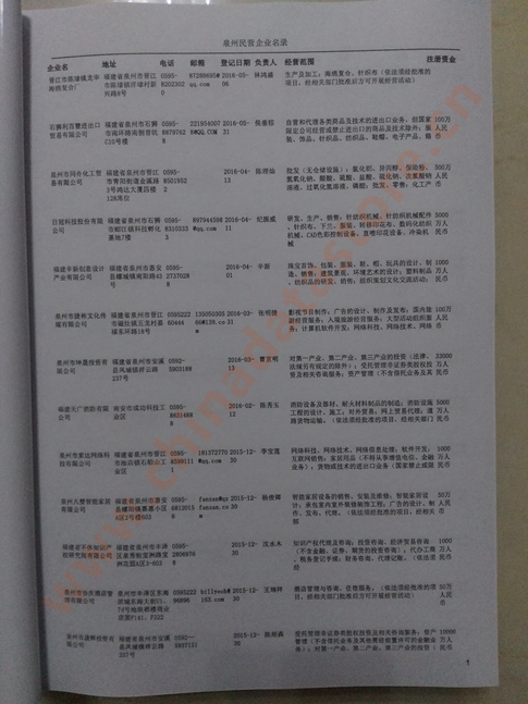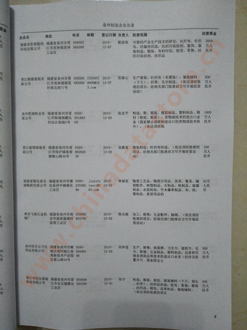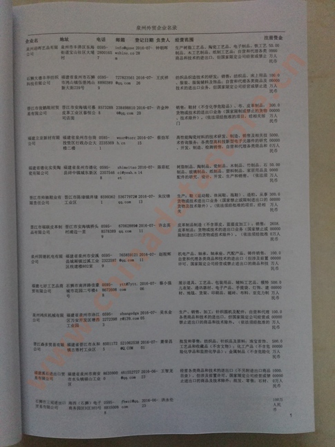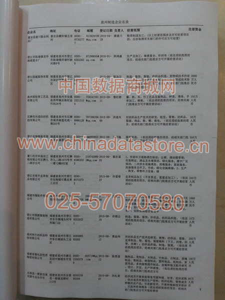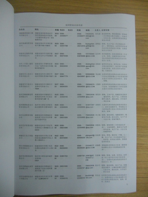 2021版最新泉州企業黃頁包括《泉州制造企業黃頁》、《泉州貿易企業黃頁》、《泉州民營企業黃頁》、《泉州外資企業黃頁》、《泉州外貿企業黃頁》共五冊,現優惠價:280元/冊。每冊內容包括:單位名稱、地址、郵編、電話、傳真、郵箱、經營范圍等;泉州企業黃頁涵蓋了近幾年來最新成立的、有一定規模的企業,具有非常高的營銷價值。有了這套黃頁開展業務也有了針對性,也省去了盲目去尋找客戶名單而浪費的時間了,工作效率也會有很大的提高。歡迎需要泉州企業黃頁的朋友及時聯系我們!