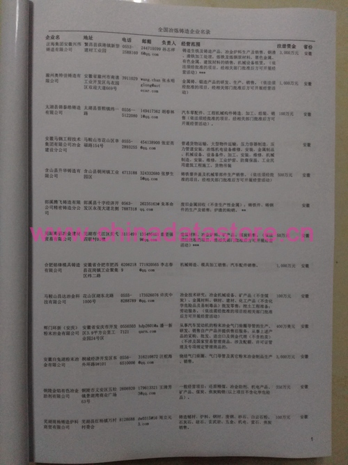| 某省或直轄市 | 如上海、浙江冶煉鑄造企業(yè)名單 | 80% - 90% | 600元 | 附贈(zèng)一冊(cè)冶煉鑄造紙質(zhì)印刷品 |