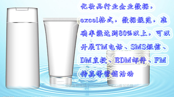 最新化妝品生產(chǎn)與貿(mào)易企業(yè)黃頁數(shù)據(jù)更新日期2024年12月最新,全國化妝品企業(yè)黃頁共66000條,都是具有一定規(guī)模的化妝品行業(yè)的注冊實(shí)體企業(yè),數(shù)據(jù)準(zhǔn)確率高,是您開展各項(xiàng)營銷活動的必備資料。企業(yè)名單包括:企業(yè)名稱、地址、電話(以上必有,以下選有)、傳真、郵箱、登記日期、經(jīng)營范圍、注冊資金等信息。化妝品企業(yè)黃頁數(shù)據(jù)為Excel格式,信息可任意修改、復(fù)制、打印、導(dǎo)出及導(dǎo)入到傳真、郵件群發(fā)等軟件中,無任何限制。