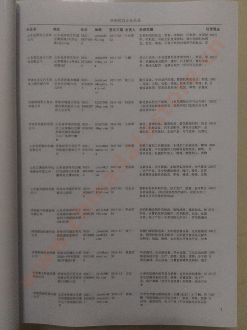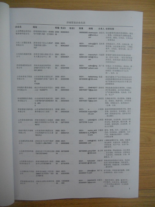 2021版最新濟(jì)南企業(yè)黃頁包括《濟(jì)南制造企業(yè)黃頁》、《濟(jì)南貿(mào)易企業(yè)黃頁》、《濟(jì)南民營企業(yè)黃頁》、《濟(jì)南外資企業(yè)黃頁》、《濟(jì)南外貿(mào)企業(yè)黃頁》共五冊,現(xiàn)優(yōu)惠價:280元/冊。每冊內(nèi)容包括:單位名稱、地址、郵編、電話、傳真、郵箱、經(jīng)營范圍等;濟(jì)南企業(yè)黃頁涵蓋了近幾年來最新成立的、有一定規(guī)模的企業(yè),具有非常高的營銷價值。有了這套黃頁開展業(yè)務(wù)也有了針對性,也省去了盲目去尋找客戶名單而浪費的時間了,工作效率也會有很大的提高。歡迎需要濟(jì)南企業(yè)黃頁的朋友及時聯(lián)系我們!