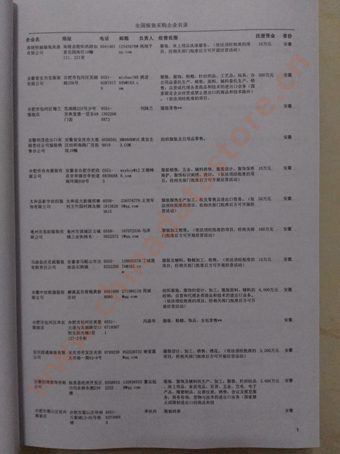 2024年新版中國服裝采購企業黃頁,收錄了全國各地經營范圍涉及服裝產品的貿易企業,這些都是頗具實力的服裝產品的中國采購商。黃頁內容包含:企業名稱、地址、電話、傳真、郵箱、經營范圍、省份、注冊資金等信息。該套黃頁包含一個黃頁光碟加一冊紙質書刊,全國的價格:1500元,省/直轄市價格:400元,城市價格:200元,共收錄了全國各地大概46646(統計日期:2018.1)服裝裝產品采購企業。黃頁光碟中是EXCEL格式,信息可任意修改、復制、打印、導出及導入到傳真、郵件群發等軟件中,無任何限制。