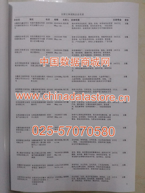 2024年新版中國(guó)文體戶外采購(gòu)企業(yè)黃頁,收錄了全國(guó)各地經(jīng)營(yíng)范圍涉及文體戶外產(chǎn)品的貿(mào)易企業(yè),這些都是頗具實(shí)力的文體戶外產(chǎn)品的中國(guó)采購(gòu)商。黃頁內(nèi)容包含:企業(yè)名稱、地址、電話、傳真、郵箱、經(jīng)營(yíng)范圍、省份、注冊(cè)資金等信息。該套黃頁包含一個(gè)黃頁光碟加一冊(cè)紙質(zhì)書刊,全國(guó)價(jià)格:1500元,省/直轄市價(jià)格:400元,城市價(jià)格:200元,共收錄了全國(guó)各地大概849(統(tǒng)計(jì)日期:2018.1)家文體戶外產(chǎn)品采購(gòu)企業(yè)。黃頁光碟中是EXCEL格式,信息可任意修改、復(fù)制、打印、導(dǎo)出及導(dǎo)入到傳真、郵件群發(fā)等軟件中,無任何限制。
