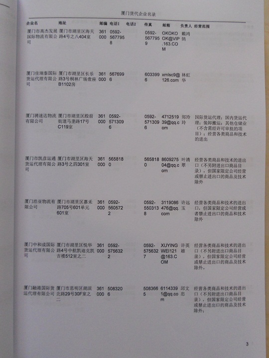廈門貨運公司黃頁包括:企業名稱、負責人聯系方式、企業電話、傳真、Email、經營范圍、地址、郵編等信息。
