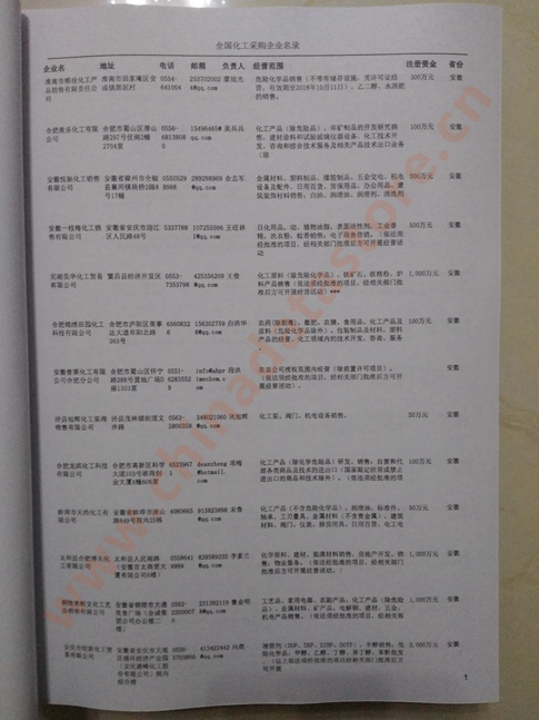 2024年新版中國化工采購企業(yè)黃頁,收錄了全國各地經(jīng)營范圍涉及化工產(chǎn)品的貿(mào)易企業(yè),這些都是頗具實力的化工產(chǎn)品的中國采購商。黃頁內(nèi)容包含:企業(yè)名稱、地址、電話、傳真、郵箱、經(jīng)營范圍、省份、注冊資金等信息。該套黃頁包含一個黃頁光碟加一冊紙質(zhì)書刊,全國價格:1500元,省/直轄市價格:400元,城市價格:200元,共收錄了全國各地大概77995(統(tǒng)計日期:2018.1)家化工產(chǎn)品采購企業(yè)。黃頁光碟中是EXCEL格式,信息可任意修改、復(fù)制、打印、導(dǎo)出及導(dǎo)入到傳真、郵件群發(fā)等軟件中,無任何限制。
