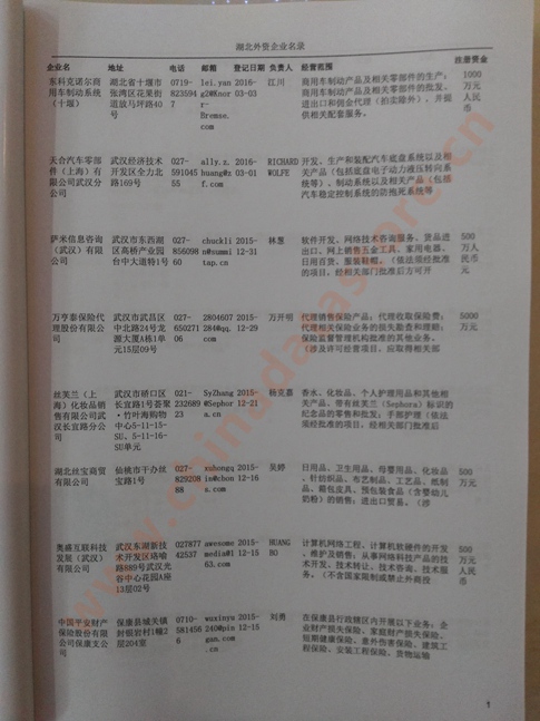 最新湖北外資企業(yè)黃頁涵蓋了湖北外商獨(dú)資企業(yè)、中外合資經(jīng)營(yíng)企業(yè)以及港、澳、臺(tái)資企業(yè),包括湖北臺(tái)資日資企業(yè)黃頁,湖北外企黃頁具體內(nèi)容包括:企業(yè)名稱、地址、電話、傳真、郵箱、經(jīng)營(yíng)范圍、注冊(cè)資金等信息;湖北外資企業(yè)名單里面的企業(yè)都一些中外合資的大企業(yè),這些公司經(jīng)濟(jì)實(shí)力都比較雄厚,出口產(chǎn)品也比較多,業(yè)務(wù)范圍都比較廣,跟他們開展業(yè)務(wù)往來都比較容易;有了湖北臺(tái)企日企黃頁開展業(yè)務(wù)也有了針對(duì)性,也省去了盲目去尋找客戶名單而浪費(fèi)的時(shí)間了,工作效率也會(huì)有很大的提高.歡迎需要的客戶及時(shí)聯(lián)系我們!