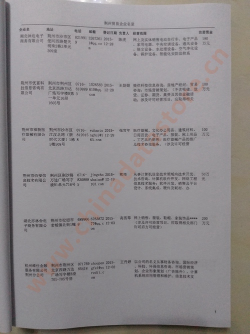 2021版最新荊州企業(yè)黃頁包括《荊州制造企業(yè)黃頁》、《荊州民營(yíng)企業(yè)黃頁》,現(xiàn)優(yōu)惠價(jià):280元/冊(cè)。每?jī)?cè)內(nèi)容包括:?jiǎn)挝幻Q、地址、郵編、電話、傳真、郵箱、經(jīng)營(yíng)范圍等;荊州企業(yè)黃頁涵蓋了近幾年來最新成立的、有一定規(guī)模的企業(yè),具有非常高的營(yíng)銷價(jià)值。有了這套黃頁開展業(yè)務(wù)也有了針對(duì)性,也省去了盲目去尋找客戶名單而浪費(fèi)的時(shí)間了,工作效率也會(huì)有很大的提高。歡迎需要荊州企業(yè)黃頁的朋友及時(shí)聯(lián)系我們!