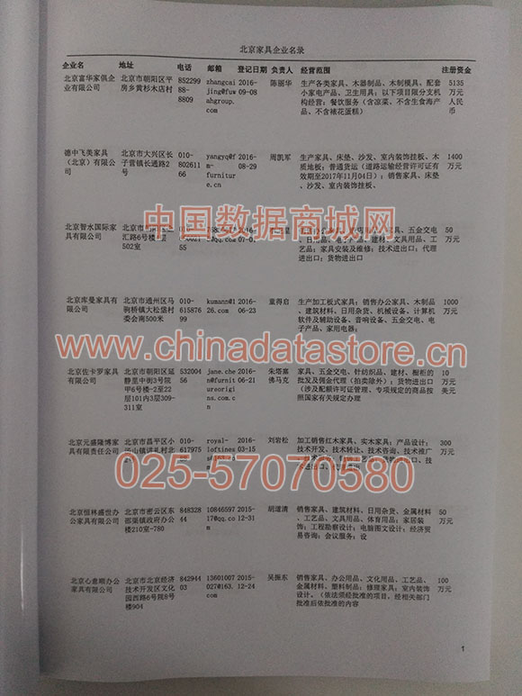 最新北京家具生產(chǎn)與貿(mào)易企業(yè)黃頁數(shù)據(jù)更新日期2024年12月最新,北京家具企業(yè)黃頁,都是具有一定規(guī)模的北京家具行業(yè)的注冊實(shí)體企業(yè),數(shù)據(jù)準(zhǔn)確率高,是您開展各項(xiàng)營銷活動的必備資料。企業(yè)名單包括:企業(yè)名稱、地址、電話(以上必有,以下選有)、傳真、郵箱、登記日期、經(jīng)營范圍、注冊資金等信息。北京家具企業(yè)黃頁數(shù)據(jù)為Excel格式,信息可任意修改、復(fù)制、打印、導(dǎo)出及導(dǎo)入到傳真、郵件群發(fā)等軟件中,無任何限制。