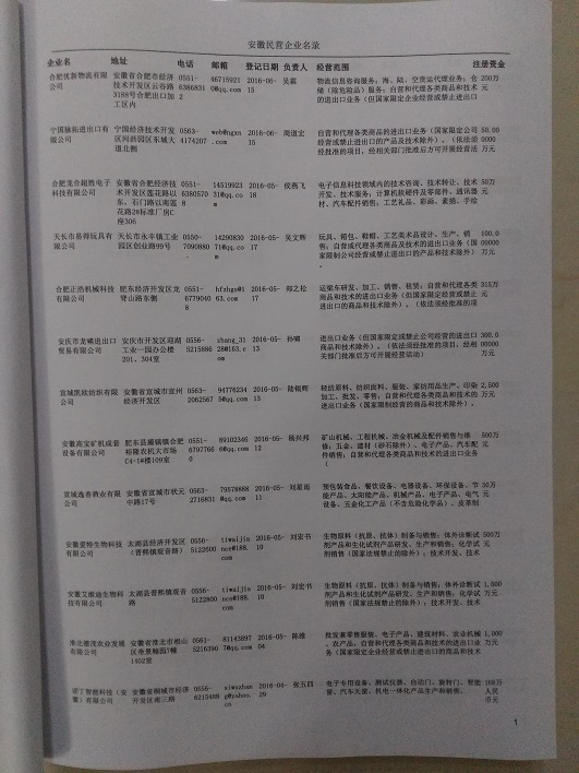 2021版最新安徽企業黃頁包括《安徽制造企業黃頁》、《安徽貿易企業黃頁》、《安徽民營企業黃頁》共三冊,優惠價:280元/冊。每冊內容包括:單位名稱、地址、郵編、電話、傳真、郵箱、經營范圍等;安徽企業黃頁涵蓋了近幾年來最新成立的、有一定規模的企業,具有非常高的營銷價值。有了這套黃頁開展業務也有了針對性,也省去了盲目去尋找客戶名單而浪費的時間了,工作效率也會有很大的提高。歡迎需要安徽企業黃頁的朋友及時聯系我們!