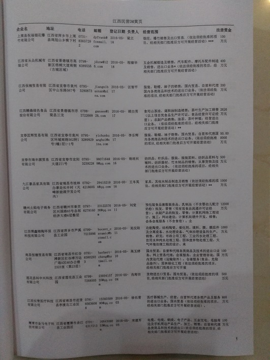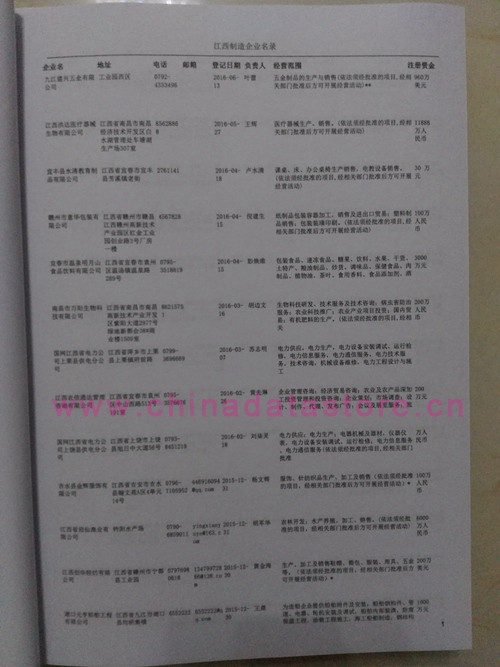 2021版最新江西企業(yè)黃頁包括《江西制造企業(yè)黃頁》、《江西貿(mào)易企業(yè)黃頁》、《江西民營企業(yè)黃頁》共三冊,優(yōu)惠價(jià):280元/冊。每冊內(nèi)容包括:單位名稱、地址、郵編、電話、傳真、郵箱、經(jīng)營范圍等;江西企業(yè)黃頁涵蓋了近幾年來最新成立的、有一定規(guī)模的企業(yè),具有非常高的營銷價(jià)值。有了這套黃頁開展業(yè)務(wù)也有了針對性,也省去了盲目去尋找客戶名單而浪費(fèi)的時(shí)間了,工作效率也會有很大的提高。歡迎需要江西企業(yè)黃頁的朋友及時(shí)聯(lián)系我們!