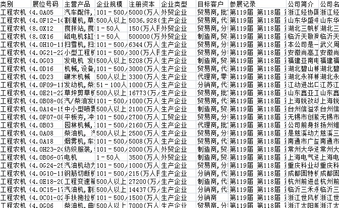 119屆廣交會(huì)參展商黃頁(yè)數(shù)據(jù)為Excel格式,信息可任意修改、復(fù)制、打印、導(dǎo)出及導(dǎo)入到傳真、郵件群發(fā)等軟件中,無(wú)任何限制。