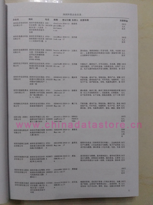 深圳外貿(mào)企業(yè)黃頁(yè)包括:外貿(mào)企業(yè)名稱(chēng)、地址、電話(huà)、傳真、郵箱、經(jīng)營(yíng)范圍、注冊(cè)資金等信息。