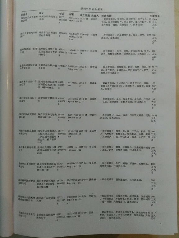溫州外貿企業黃頁包括:外貿企業名稱、地址、電話、傳真、郵箱、經營范圍、注冊資金等信息。