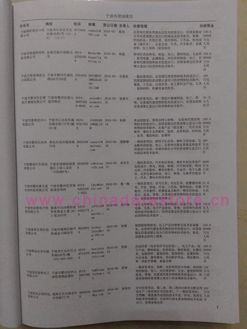 寧波外貿企業黃頁包括:外貿企業名稱、地址、電話、傳真、郵箱、經營范圍、注冊資金等信息。