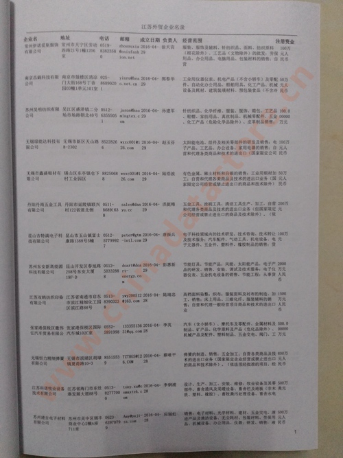 江蘇外貿企業黃頁包括:外貿企業名稱、地址、電話、傳真、郵箱、經營范圍、注冊資金等信息。