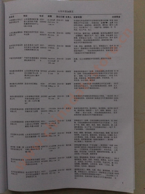 山東外貿(mào)企業(yè)黃頁(yè)包括:外貿(mào)企業(yè)名稱、地址、電話、傳真、郵箱、經(jīng)營(yíng)范圍、注冊(cè)資金等信息。