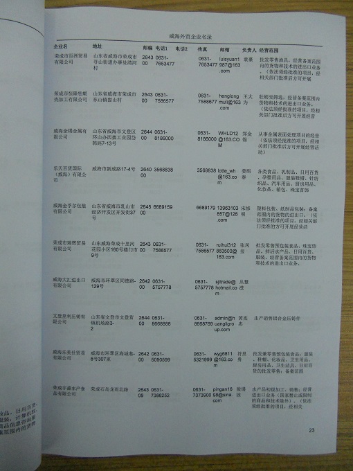 威海外貿企業黃頁包括:外貿企業名稱、地址、電話、傳真、郵箱、經營范圍、注冊資金等信息。