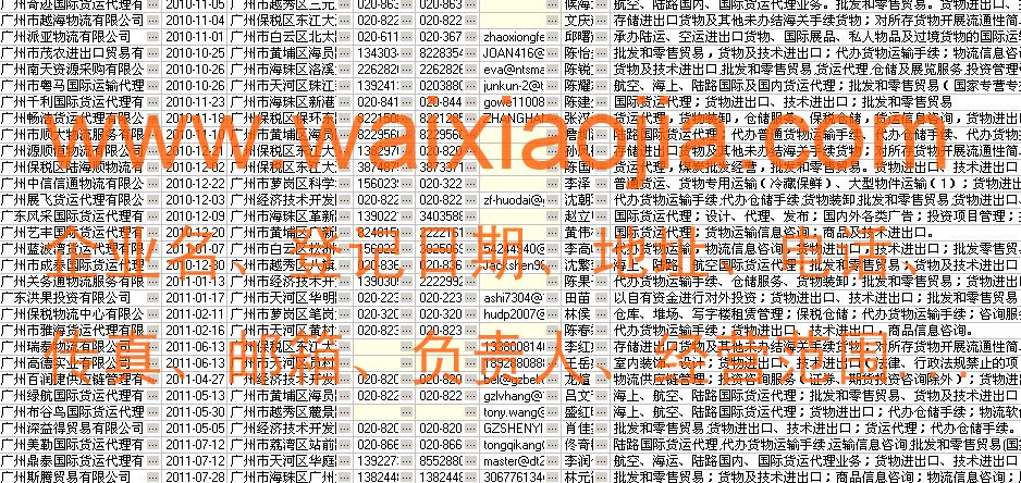 廣州貨運代理公司名單數據為Excel格式,信息可任意修改、復制、打印、導出及導入到傳真、郵件群發等軟件中,無任何限制。