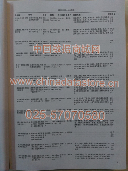 四川外貿企業黃頁包括:外貿企業名稱、地址、電話、傳真、郵箱、經營范圍、注冊資金等信息。