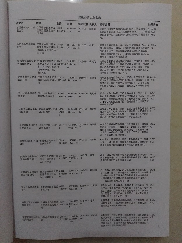 安徽外貿企業黃頁包括:外貿企業名稱、地址、電話、傳真、郵箱、經營范圍、注冊資金等信息。